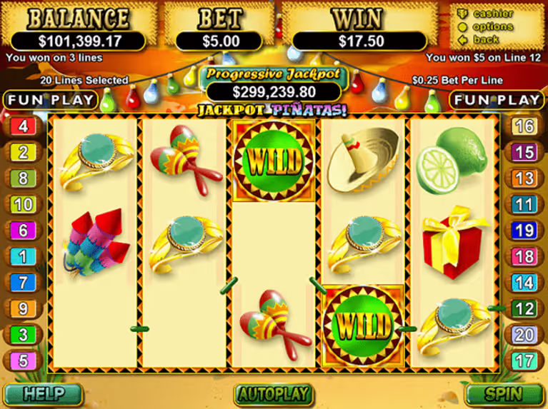 Get ready for a fiesta of winning opportunities with Jackpot Piñatas Slots, where Mexican celebration meets serious cash potential. This colorful 5-reel video slot from Real Time Gaming transforms every spin into a vibrant party atmosphere, complete with progressive jackpots that can turn your modest bet into life-changing money. With 20 paylines of action and bonus features that pack more punch than a piñata full of prizes, this game delivers both entertainment and real winning chances for US players.